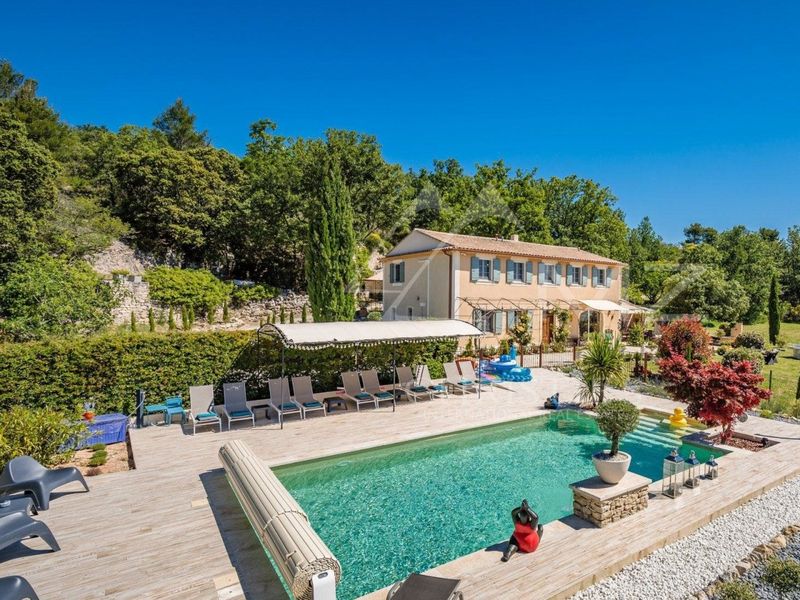 Espaces climatisés de 300 m² avec 5 chambres et 5 salles de bain dans une propriété de 6 hectares avec piscine chauffée, terrain de pétanque, ping pong, babyfoot. Vue panoramique sur le village et sur le grand Luberon.