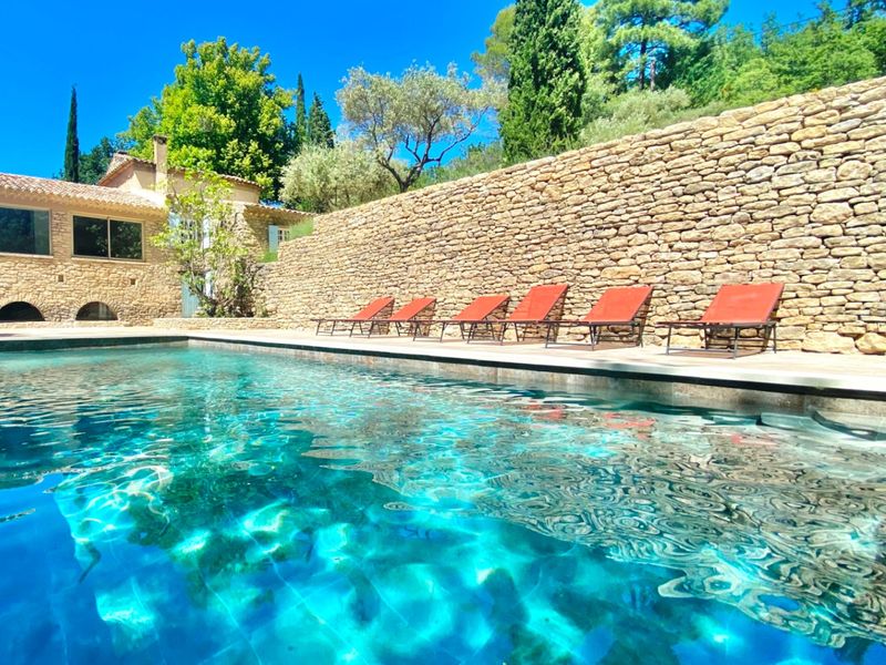 Plusieurs grandes terrasses ombragées par des arbres centenaires avec une vue époustouflante sur la vallée d'Apt et le Mont Ventoux, 4 hectares divisés en restanques bordées de murs en pierre sèche, forêt, rivière, grotte, piscine à l'eau turquoise foncé avec des reflets verts située dans une clairière baignée de lumière.