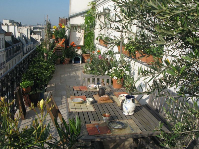 L'espace "open space" dispose d'un salon, d'une une salle à manger pouvant accueillir jusqu'à 10 personnes à table, d'une cuisine équipée, et d'un accès à un long balcon. L'escalier en acier et en bois mène directement à l'étage supérieur, où se trouve un bureau et une salle de bain carrelée de blanc. D'un côté, une vue sur tout Paris, de l'autre, une terrasse fleurie.