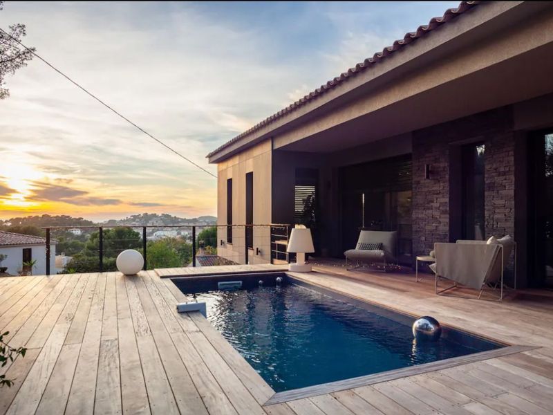 Notre maison est ultra contemporaine avec beaucoup de meubles iconiques des années 70. Les murs et les plafonds sont fabriqués dans un atelier appelé Viroc, qui sont de grands panneaux de bois et de ciment compressés donnant l'impression que la maison est en béton brut. Elle est orientée au sud au niveau de la piscine et à l'ouest au niveau du salon avec une immense baie vitrée à cadre fixe donnant une vue plongeante sur la plaine et offrant de magnifiques couchers de soleil