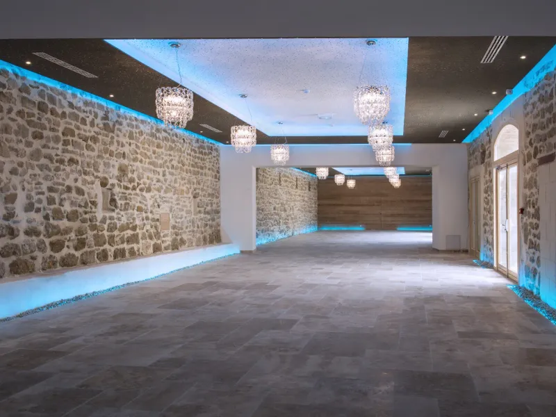 Il s'agit d'une belle salle de réunion située sous des voûtes en pierre, lumineuse et accueillante grâce à la lumière qui pénètre par les fenêtres. Les arcs de pierre sculptés confèrent à l'espace un sentiment de dignité et de calme, ce qui en fait un lieu idéal pour des discussions réfléchies et des décisions partagées.