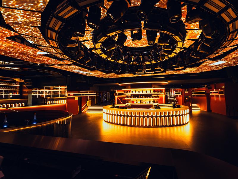 de danse centrale spacieuse, d'espaces VIP surélevés avec vue panoramique et d'un système de sonorisation atmosphérique de haute qualité capable de façonner la dynamique de chaque événement