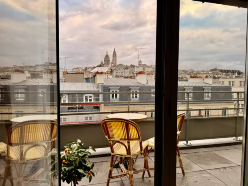 Voici les points forts qui pourraient intéresser vos clients : * Espaces extérieurs uniques : une terrasse privée de 30 m² sur le toit avec vue sur Paris, un balcon sur toute la longueur du salon et un troisième balcon desservant deux chambres. * Espaces de vie : un grand salon/salle à manger avec cuisine ouverte offrant une vue directe et spectaculaire sur la basilique du Sacré-Cœur.