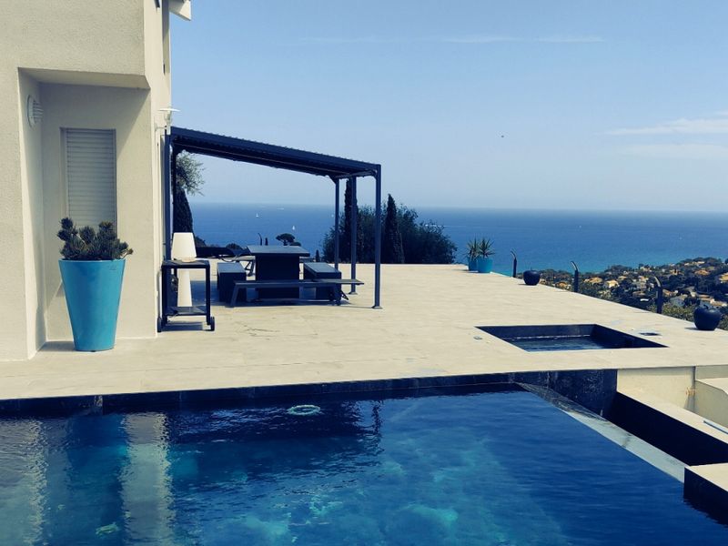 Cette charmante villa contemporaine avec pleine vue mer, située à flanc de colline et adossée au massif des Petites Maures.