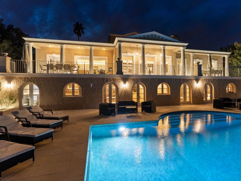 Immenses espaces extérieurs avec grande piscine privée et poolhouse, barbecue extérieur, grand héliport situé dans le jardin inférieur.