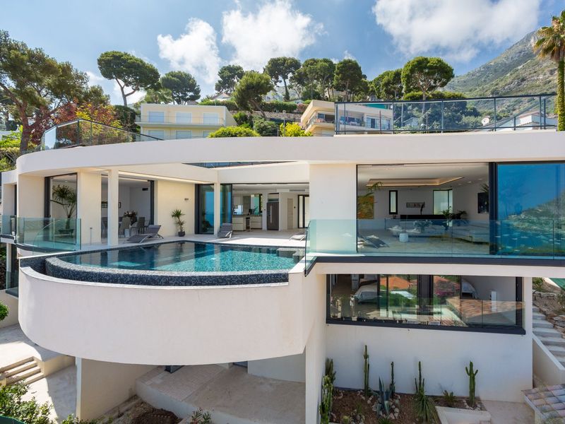 Immersion complète dans la Grande Bleue pour cette villa d'exception sur la Riviéra, entre Nice et Monaco, avec une vue à 180° sur la Méditerranée. Située dans un beau quartier résidentiel et calme sous le village d'Eze, plage à 7 minutes à pied. Architecture tres contemporaine, piscine à débordement chauffée , terrasse de 230m2 sur le toit, cinq chambres en suite. Pour 10 ou 12 personnes