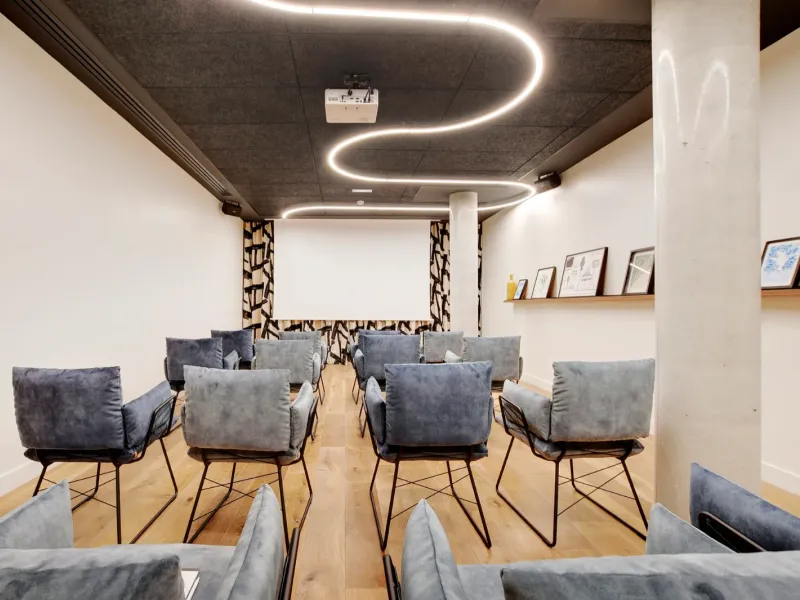 45 m² meeting room with parquet floor. Equipped with flipchart, TV screen with video connection via HDMI cable. Wi-Fi connection.