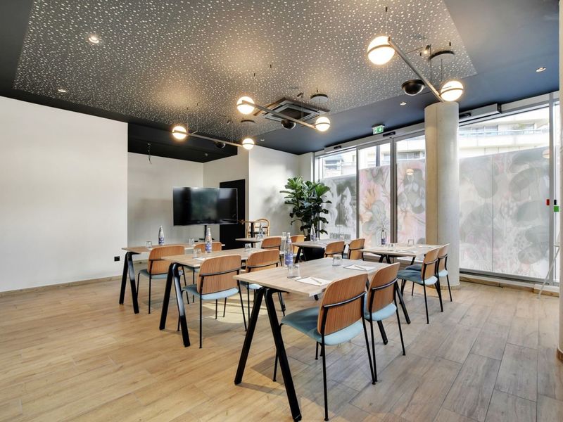 45 m2 meeting room with parquet flooring. Equipped with flipchart, TV screen with video connection via HDMI cable. Wifi connection.