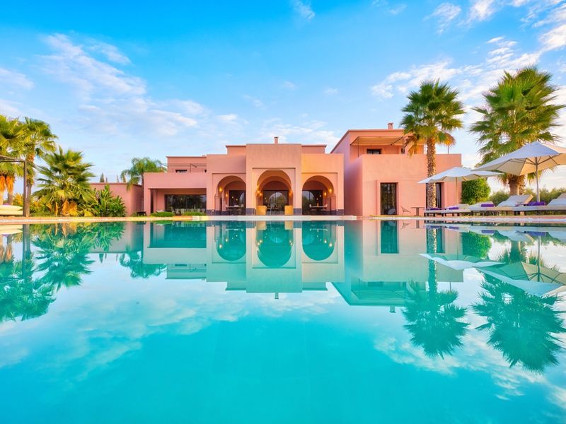 We present to you this exclusive luxury villa of 1900m², with refined Arab-Andalusian architecture with a breathtaking view of the Atlas. This large prestigious property, 20 minutes from Marrakech, is hidden in the heart of a 1.7 ha green setting, far from the hustle and bustle of the city. It offers all the comfort you need for an exclusive stay in Marrakech. The park around the swimming pool can accommodate up to 500 guests. A brand new sky bar and a bar in the pool house will promote the attractiveness and diversity of the place. The comfortable lounges, equipped with fireplaces, can accommodate up to 150 people. The estate also offers a 25x11 m swimming pool with 2 integrated jacuzzis for 8 people/