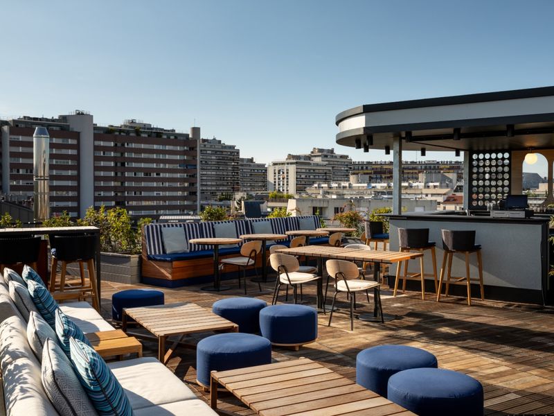 Perched on the sixth floor of the hotel, the rooftop bar is an urban oasis, ideal for hanging out, enjoying panoramic views of the city.