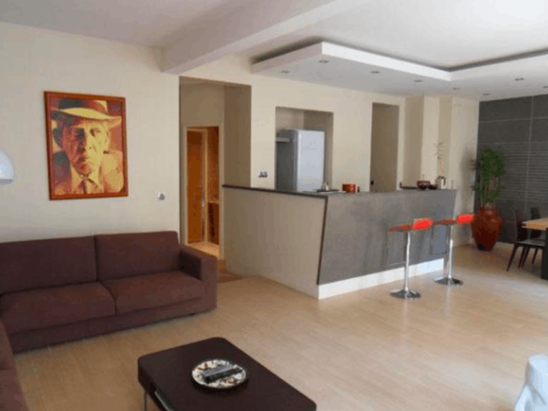 The living room has a very large tv screen which is ideal for a unique home cinema experience or for an appealing presentation during a professional meeting.