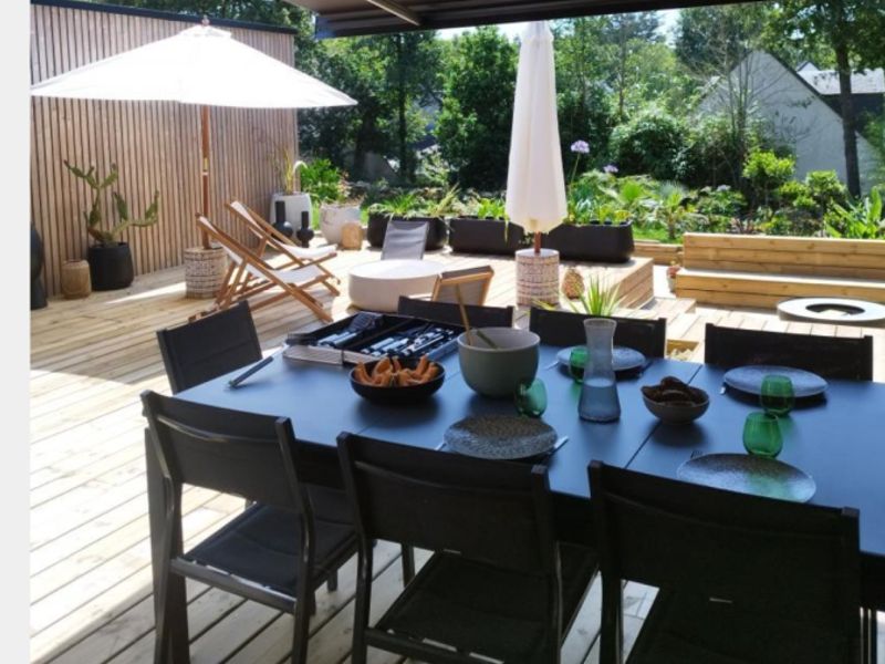 A 200 m² architect-designed villa in new wooden frame on the heights of La Trinité-sur-mer, built with noble materials. Come and enjoy the huge terrace with solarium, jacuzzi, hammam, brazier, a large kitchen with 2 islands and high-end equipment.