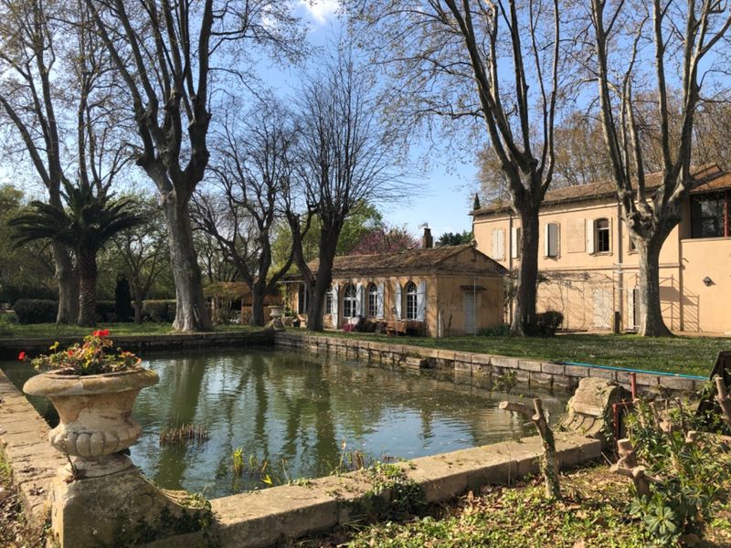 A Garden in Provence, in the shade of a century-old plane tree, reception rooms, a pond, koi carp, punctuated by a few water lilies, a privileged place in the heart of one of the most beautiful farmhouses in Arles.