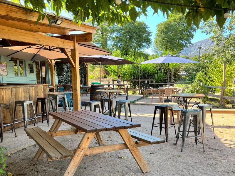 Atypical wooden restaurant with terraces and catering equipment available for events, with 2500m² flat plot of land near Ajaccio, with easy access and parking.
