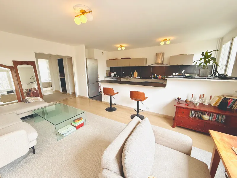 A bright, all-white 64 m² flat with a modern, streamlined feel. It has a spacious, convivial living room, opening onto a functional, discreet, integrated open-plan kitchen. The living space is bathed in natural light thanks to large windows, creating a warm, airy ambience.