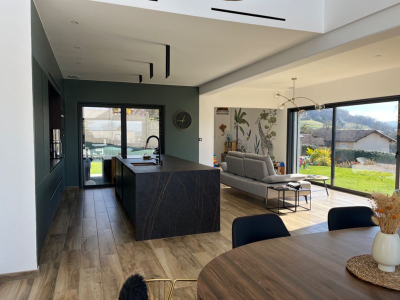 Overall, a home with a contemporary and clean style with modern and warm decorative elements. It is designed to maximize natural light and highlight natural materials like wood. The decoration choices, from neutral colors to subtle accessories, create a space that is both elegant and welcoming.