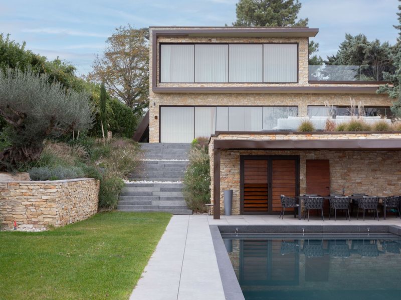 Superb garden with full view of Lyon, 15m x 5m swimming pool, golf green, olive trees and dry stone facades.
