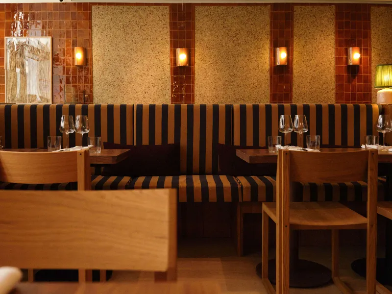 Restaurant divided into 3 areas, designed by a renowned architectural studio in the heart of the 6th arrondissement. Warm, cosy atmosphere. Play on materials: wood, mirrors, ceramics, plants, linen sails. Listed shop front.