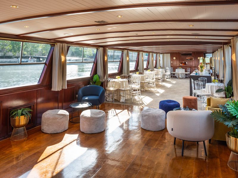 The boat offers an elegant and intimate setting, ideal for hosting private and professional events. Its cosy atmosphere, enhanced by period wood panelling and paintings, makes it a true private lounge dedicated to conversation and conviviality. Suitable for both corporate events and private celebrations. The boat is particularly popular for seminars and small-group team-building sessions, in a warm and refined setting.