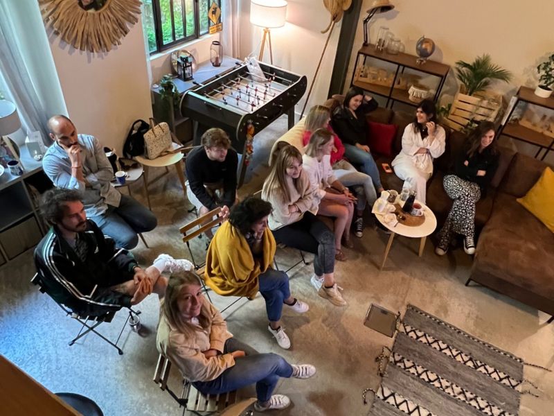 Ground floor of a house in the neighborhood of Saint-Chaumont which was Christian Louboutin's first workshops. The ground floor includes a living area with large sofas, television and table football, a kitchen with a table for 16 people, a terrace with a surface area of approximately 50 m² surrounded by greenery.