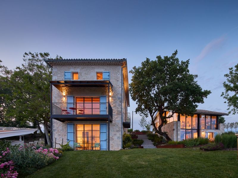 In the peaceful region of Quercy in Tarn-et-Garonne, the farmhouse is well known for its medieval villages, markets, vineyards, and ancient chateaus. The newly renovated country house blends tradition with contemporary architecture and features mid-century modern furniture and 20th-century art. This is a high-end, architect-designed home with premium fittings, modern and refined interior design, and custom furniture throughout.