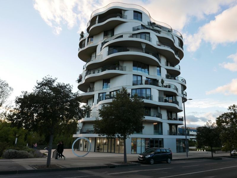 Located at the foot of a unique building, an iconic architectural madness of Montpellier in the Port Marianne district. View of the vegetation, a sensation of elsewhere while being in an urban environment.