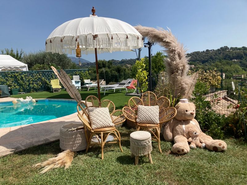 Large swimming pool with private garden and terraces, around ten parking spaces. Possibility of having tables, chairs and parasols for 30-40 people. Fridge, large freezer, barbecue available, optional. Personalized themed decoration service - on request.