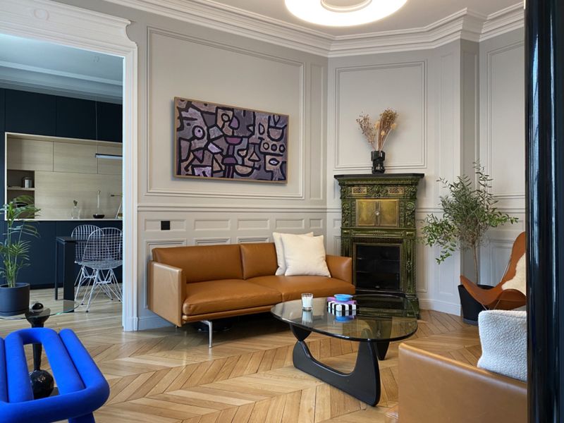 The apartment is located in the 10th arrondissement near the Canal Saint-Martin. Haussmann-style apartment, completely renovated by an architect. You will find old light oak parquet flooring, Hungarian point in the living room, moldings, a Pompadour fireplace in the library, a Prussian stove in the living room.