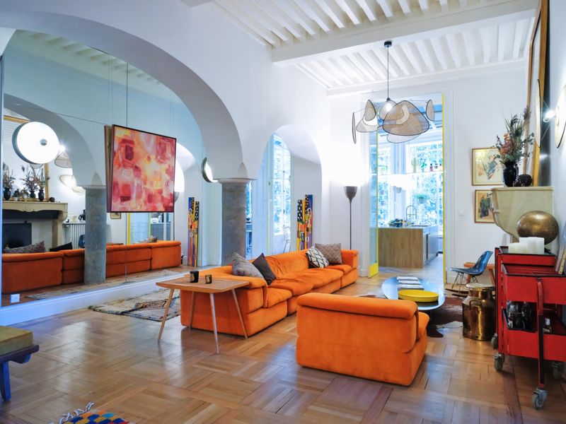 In a haven of greenery and woods of 2 hectares on the banks of the Rhône in the immediate vicinity of the city center of Lyon, our apartment is a floor of an old residence from around 1750, with a porch on the main facade, a terrace, a garden and vegetable garden of 1000 m², and a wood of half a hectare.