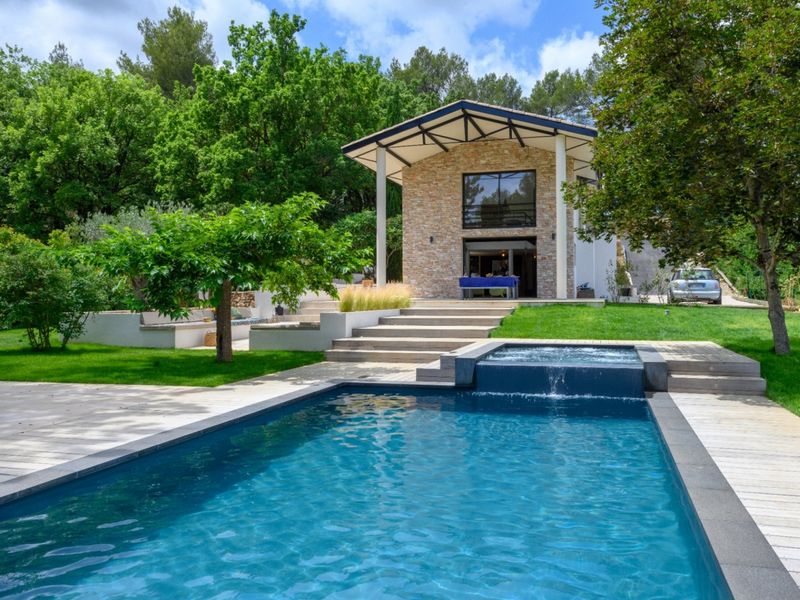 This beautiful villa with a view of the Sainte Victoire mountain offers a landscaped garden with swimming pool and infinity jacuzzi, a stone pool house and not overlooked. Renovated farmhouse type house, glazed from top to bottom, with parquet flooring throughout the house and a glass walkway.