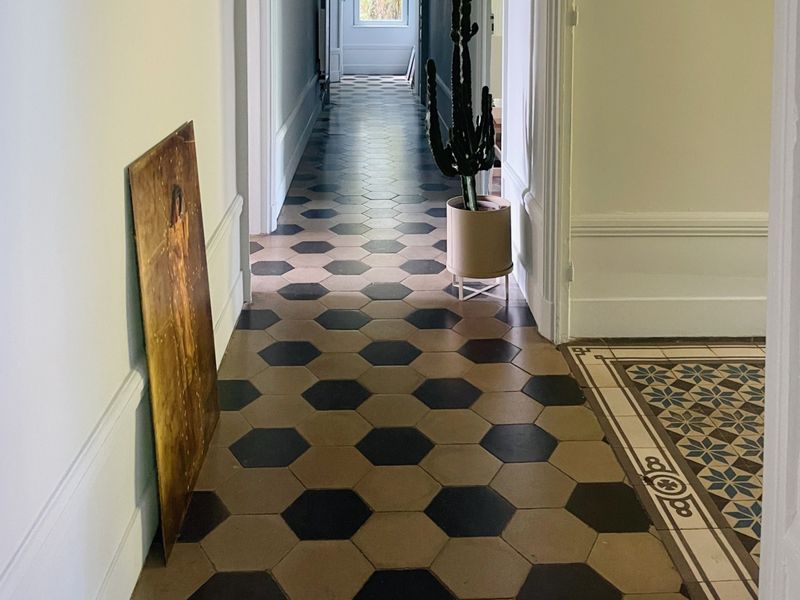 300 m² space, old materials, fireplace, polished concrete, painted parquet flooring