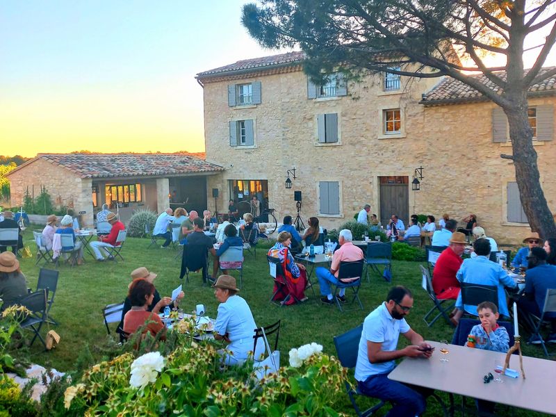 Supply of tables and chairs (for up to 120 people). Sale of organic wines from the estate by the glass or bottle.