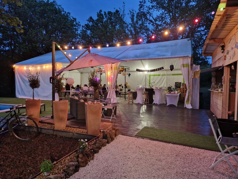 At the edge of a swimming pool and in the forest with equipped kitchen. A 10x15 structure accommodating 100 people for a wedding, a pool party, a birthday, etc.