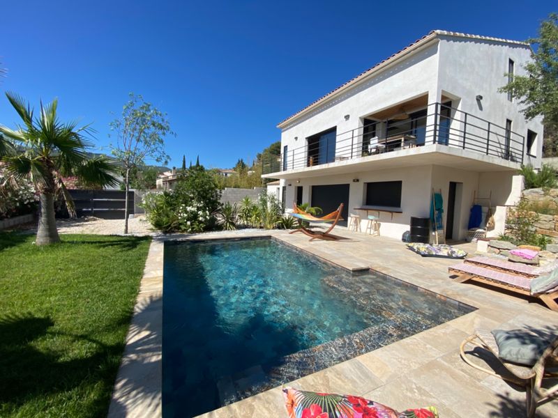 The house is located in a very quiet area, on the edge of Marseille, it is from 2021 and built by an architect. It has a large living room with high ceilings, a very clear view of the hill, and the swimming pool area, very nicely furnished.