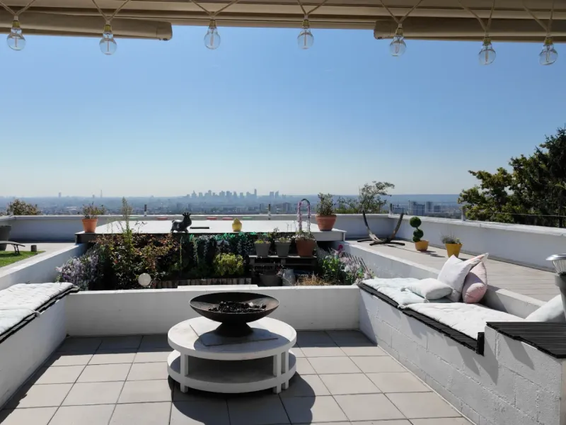 Inside, the 80 m² penthouse features a large open-plan living room, a designer kitchen and picture windows opening directly onto the outside, bathing the space in natural light. The refined style, combining wood, metal and contemporary decor, creates a warm, chic atmosphere.