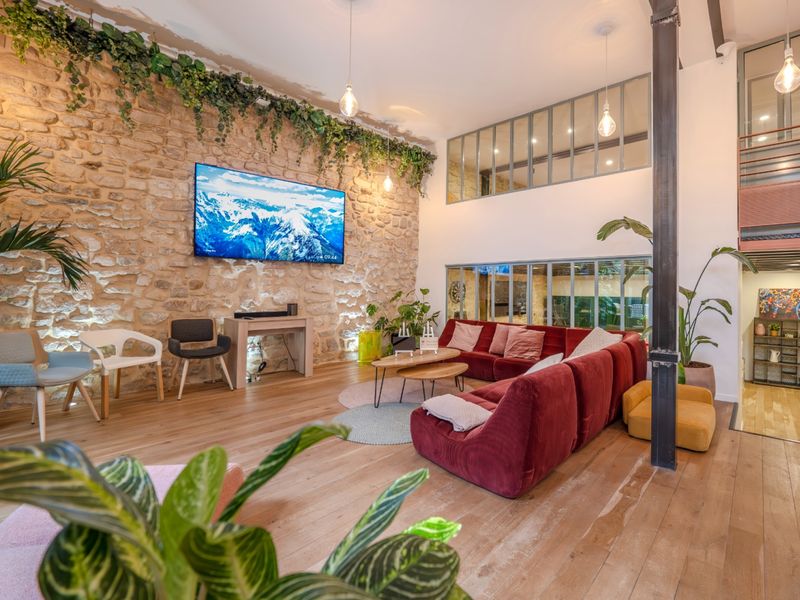 The 160 m² loft will be entirely private to you. We provide you with a large living room with a ceiling height of 4.5 meters, a furnished terrace of 20 m², a fully equipped kitchen (which can accommodate culinary activities with a chef and work groups), a games room modular with convertible billiards, and finally 2 spaces upstairs allowing small groups of 10 people to come together.