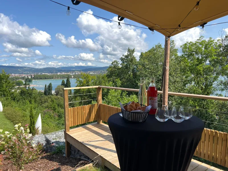 Discover our private area, nestled in the heart of nature between the forest and the lake, ideal for your lunch or dinner cocktails. Enjoy a unique setting overlooking Lake Annecy, sharing a convivial moment under our nomad tent, with a breathtaking view of the lake and surrounding mountains.