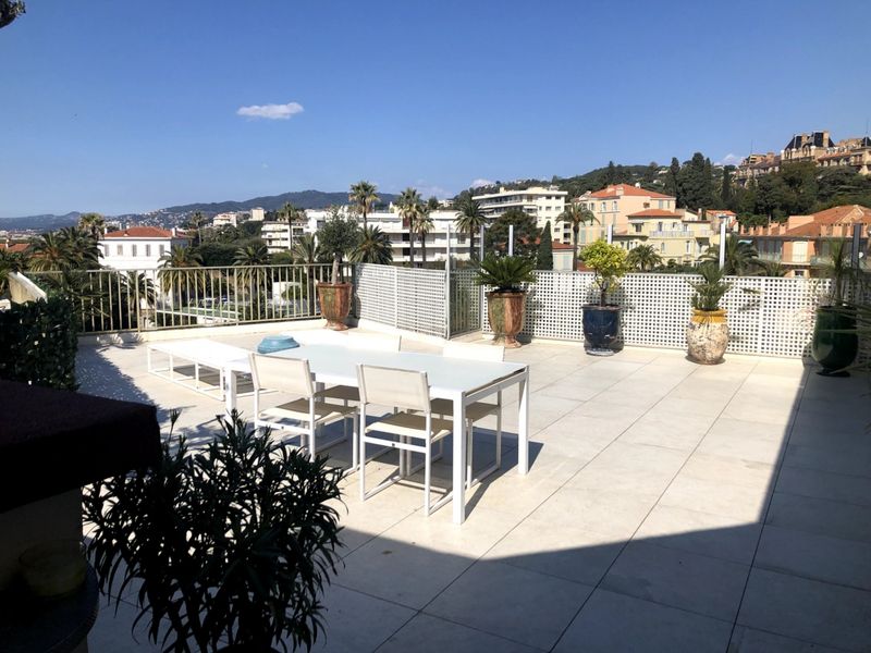 Private terrace on the 6th and top floor, by the sea and 3 minutes walk from Cannes city center. Facing South and West, ideal location for a cocktail at the end of the day and enjoying the sunset over the Esterel