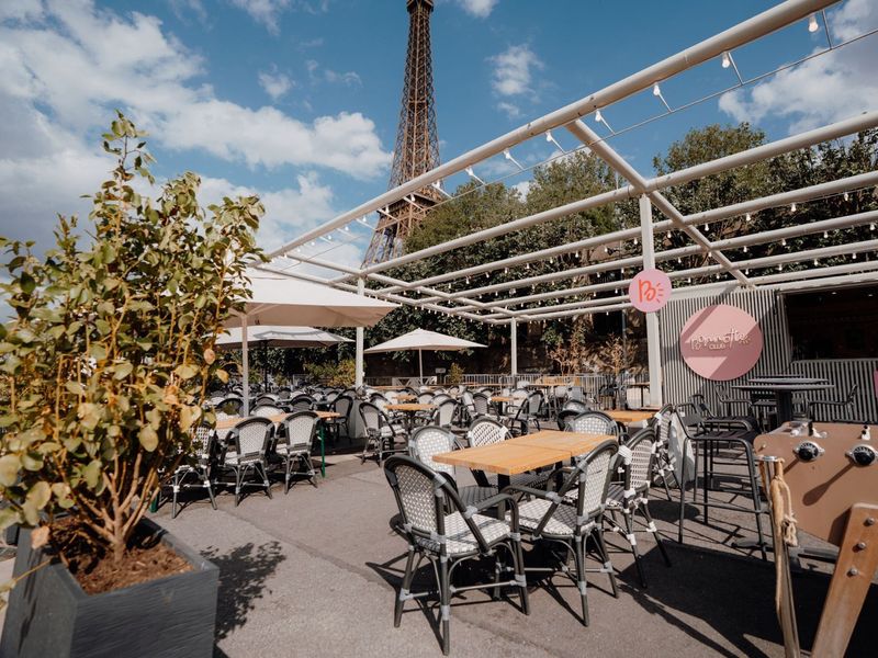 Large terrace on the banks of the Seine with breathtaking views of the Eiffel Tower. Festive open-air café.