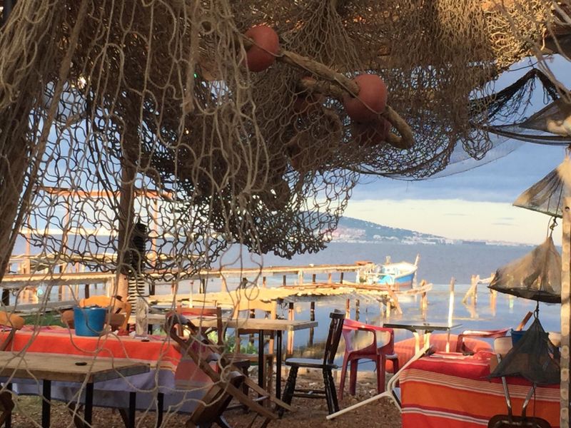 Café terrace in the oldest oyster growing area of the Lagoon of Thau. On the water's edge and breathtaking view. It's a journey through time.