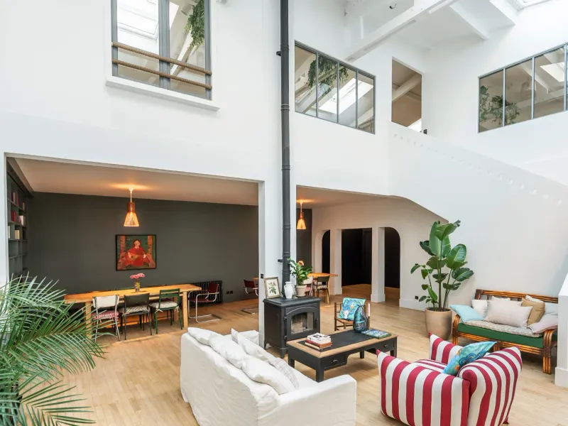 This former artist's studio has been converted into a 200 m² loft on two levels, with a glass roof and high ceilings. Lots of natural light thanks to the numerous Velux windows.